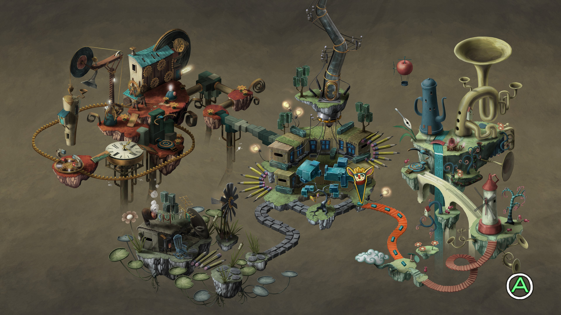 Figment doesn’t spend too long on the details of the background–only a few seconds of audio without visuals; a family’s car wreck that ends in a child’s screams. The vagueness feels intentional, as it lets you see the following hours as a metaphor for our own (potential) struggles with depression, inadequacy, and apathy. As such, it seems determined not to scare away any players who might benefit from its message, slamming you not with graphic imagery but with vividly colored storybook landscapes channeling Escher, DalĂ­, and Maurice Sendak. Personality abounds, whether it’s the bright greens of the creative side of the mind or the clockwork and steam of the logical left. It creatively embraces music beyond the song-and-dance routines of the bosses, right down to French horns jutting from cliffs or ukelele plants that strum in harmony with the soundtrack as you pass. By the time it decides to get gloomy as you’re navigating through stacks of unpaid bills and spilled coffee near the conscious mind, you’re ready to face it. It’s a beautiful transition.