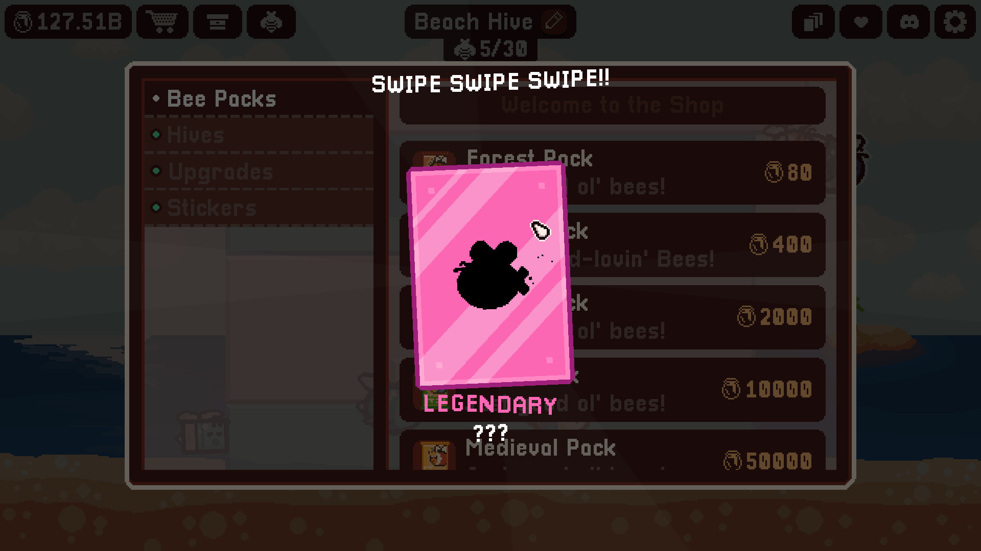 Even though I knew exactly what I was signing up for, I was still disappointed here. This game has very bad quality of life, and some baffling UI decisions. Some things are strangely laggy for no good reason. Your passive income only updates the counter once a minute or so (seriously?). The rosters of your hives and bees are awful to menu through with oddly placed buttons and getting stuck on empty pages that shouldn’t even be present. Feeding is laborious with strange hitboxes on the food and bee behavior ensuring your babies will slowly fly circles around the food and waste time. The balancing of the game means the optimal way to play is to sit there opening packs (slow and bad, why does discarding take forever?), feeding (bad), and selling (annoying) until you can afford the next hive, for a dozen hours on end, with no variation. The bee designs are strangely uninspired and arbitrary (at least chillquarium has real fish). There is no good incentive to play this game at the best of times, but once you’ve seen all the bees, there’s really absolutely nothing there at all.