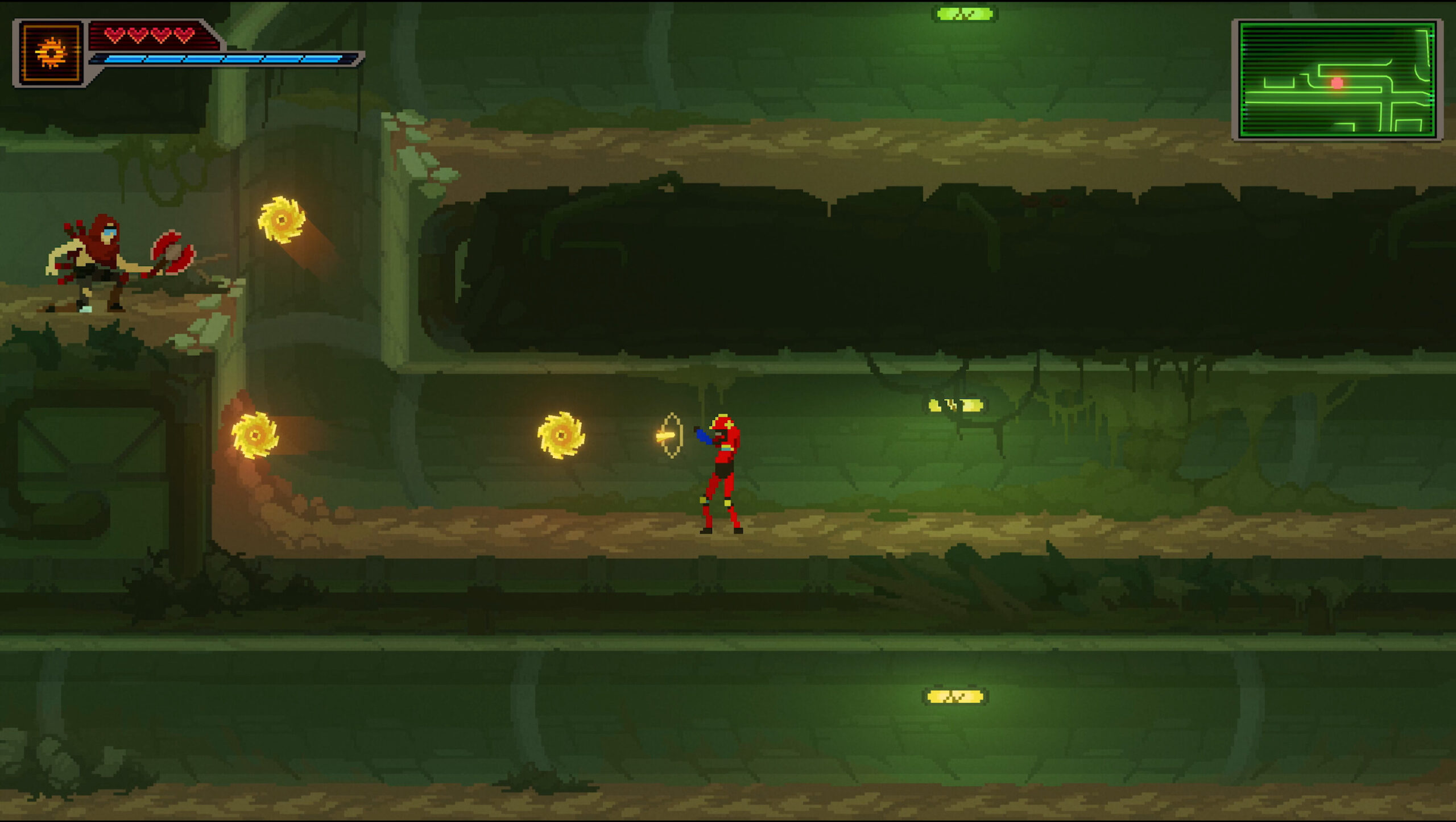 None of these familiar Metroidvania powers can hold a candle to the joy of riding your bike, which changes the game once you gain access to it. Summonable at any time with the press of the B button, your bike enables you to traverse the sizable map of Turbo Kid at top speed and access new areas by launching yourself up half pipes. This bike isn’t just a glorified boost either, you can do tricks and have full control over your rotation which is required to make it through some tricky sections.
